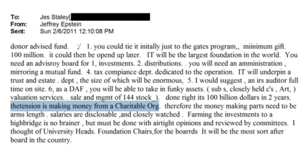 1. Offshore struktura za cjepiva (2011.) U e-mailu iz kolovoza 2011. Epstein piše Mary Erdoes o donor-advised fondu povezanim s Gatesom (DAF – vrsta dobrotvorne zaklade koja omogućuje veliku kontrolu donatora) i izričito spominje: „Treba biti spreman s offshore krakom – posebno za cjepiva.“ Odgovor dolazi brzo, bez vidljivih znakova da je JPMorganov compliance odjel intervenirao.
