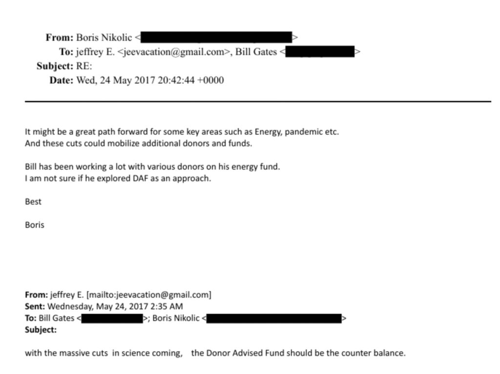 3. Pandemija kao investicijska kategorija (2017.) Tri godine prije COVID-19, Boris Nikolić piše Epsteinu i Gatesu o donor-advised fondovima i navodi: „To bi mogao biti odličan put naprijed za neka ključna područja kao što su energija, pandemija itd.“ Pandemija se tretira kao ravnopravna investicijska vertikala, a ne kao izvanredna situacija.