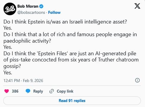 U prilog ovome govori i tweet Boba Morana, britanskog političkog karikaturista i komentatora, koji je stekao veliku popularnost u alternativnim i anti-establišment krugovima tijekom COVID-19 razdoblja. Bio je poznat po oštrim karikaturama koje su kritizirale lockdownove, cijepljenje, vladine mjere i medije – često se svrstava uz “teoretičare zavjere” ili “truthere”, a on sam je postao glas kritike prema mainstream narativima. No, sada Bob Moran kaže: