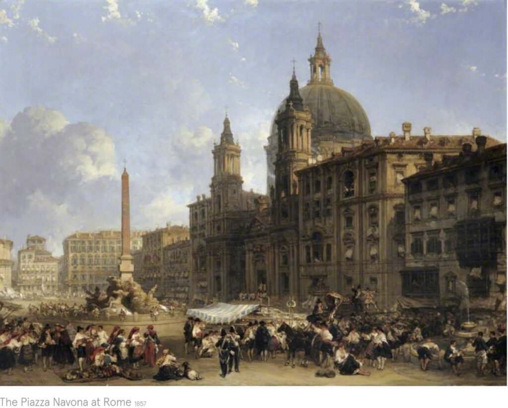 Nadalje, brojne umjetničke slike, poput one centra Rima iz 1857., prikazuju i građevine koje tu prema službenoj priči ne bi trebale biti, već izgrađene između 1870-tih i 1920-tih, poput građevina iza obeliska na predmetnoj slici.