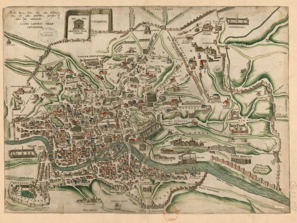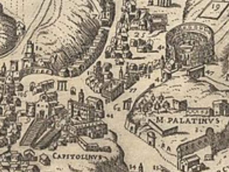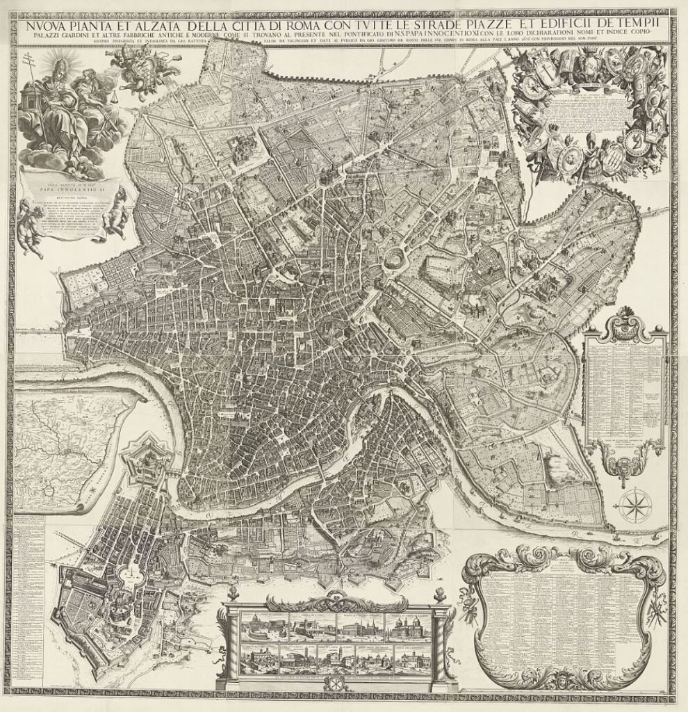 Ali one ne samo da još i danas postoje, već ih nekakvim „čudom“, nema u srednjem vijeku – pogledajte ovu kartu Giovannija Battiste Falde iz 17. stoljeća. Nema nikakvih ruševina oko Koloseuma!?